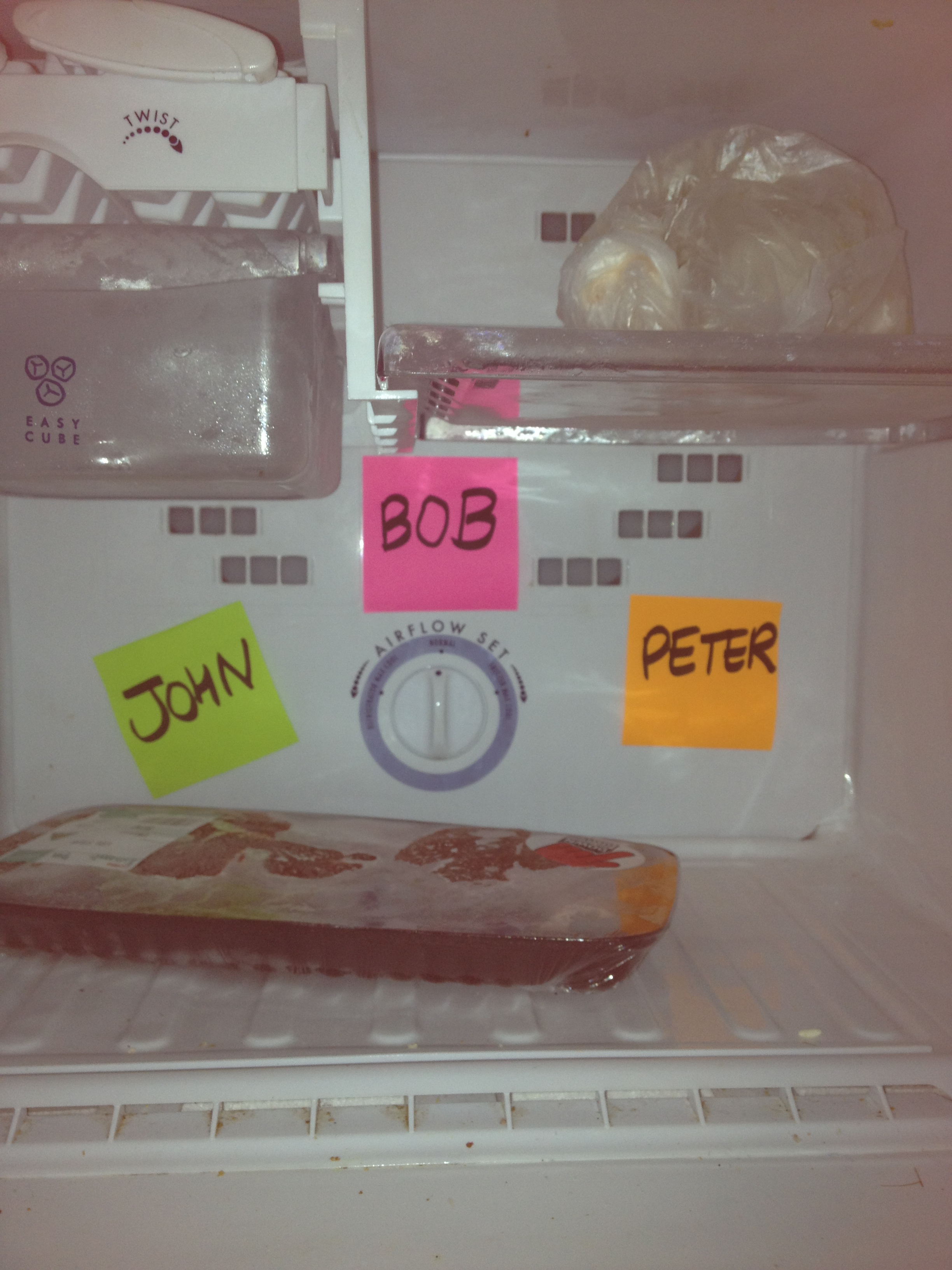 Of course, there’s loads of other solutions as well. Just speak to my mother. You see, mum and dad sired four daughters, of which I am one (the nutty youngest if you really must know). And from those four daughters, there’s been five marriages. The interesting bit is, depending on your point of view, there’s also been four divorces. Now, if you’re a pessimist, you might say that’s a bad thing, but I like to think we’re a bunch of overachievers. I mean, the average divorce rate is at about 50%. Not in my family. No, we sit at 80%. Now, that’s what I call gifted. Although some days I can’t help but feel a little like a Kennedy. But I digress. After each divorce mum, who naturally blames every bloke for the failure of the marriages (she’s not far wrong), writes their name on a piece of paper, and puts it in the freezer. Yes, you heard right. She freezes them. Apparently, some old witch (could have been my grandmother), told her about this little tradition which is meant to somehow curse the blokes in question for all eternity. So mum’s freezer looks a little like this (but with far more food in it).