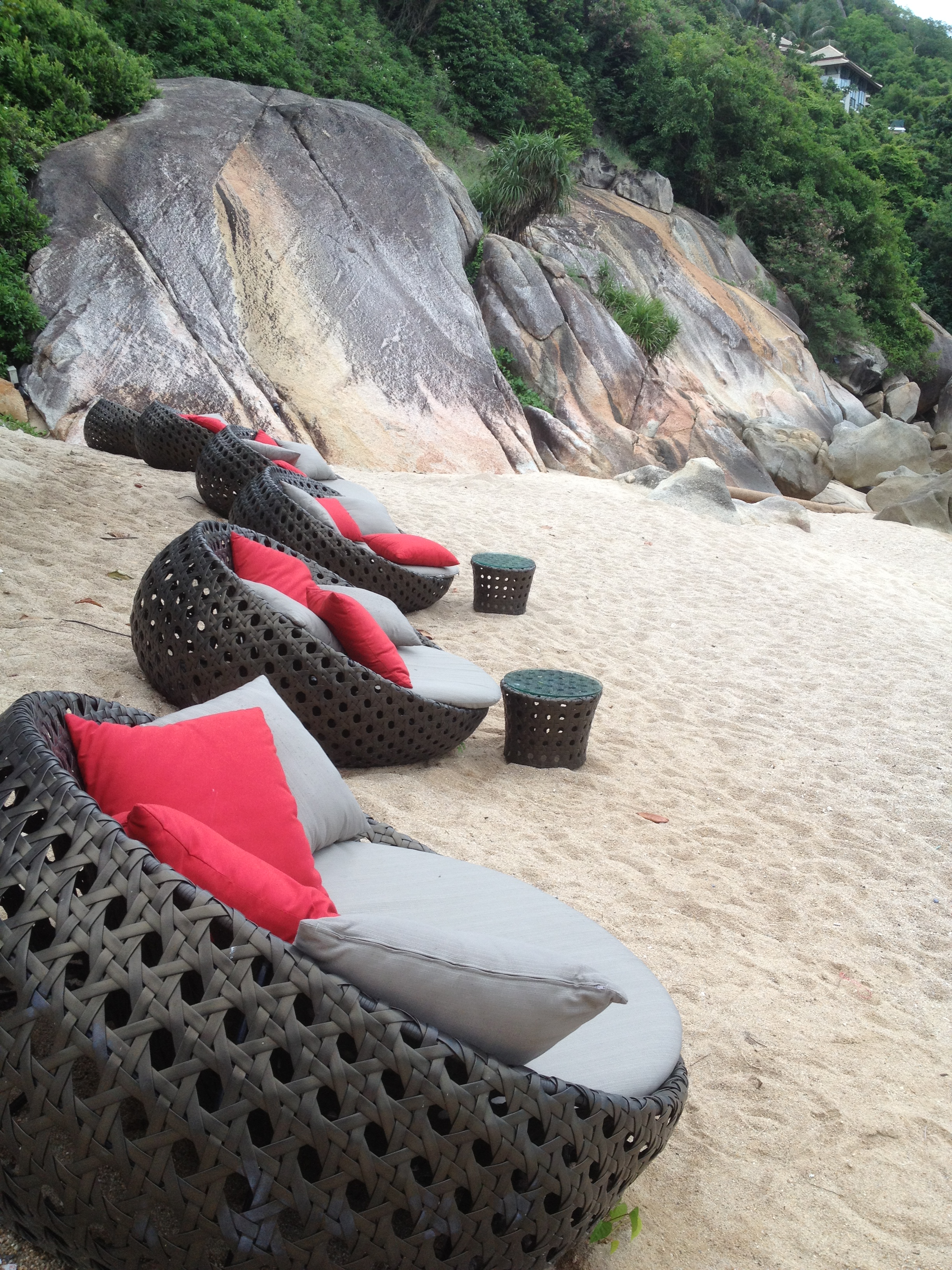 We fly on to the Banyan Tree Koh Samui where again, we’re each in a luxury pool villa which triggers a series of late-night skinny dips, the sounds of my friends splashing happily away into the night through the rainforest which divides us. I’m thrilled, as apart from the requisite Banyan Tree bath robe and slippers, there’s some orange chunky thongs which the Thai’s call flit flots. And flit flot around in them I do. Around my room, around the pool, around the resort. What I don’t realise at the time is that no one else has these in their room, they are not part of the resort wear, and I am wearing someone else’s shoes. In Thailand I discover I am a closet kleptomaniac. First the golf buggy, now other people’s footwear. What next for me, a cute small child or two?