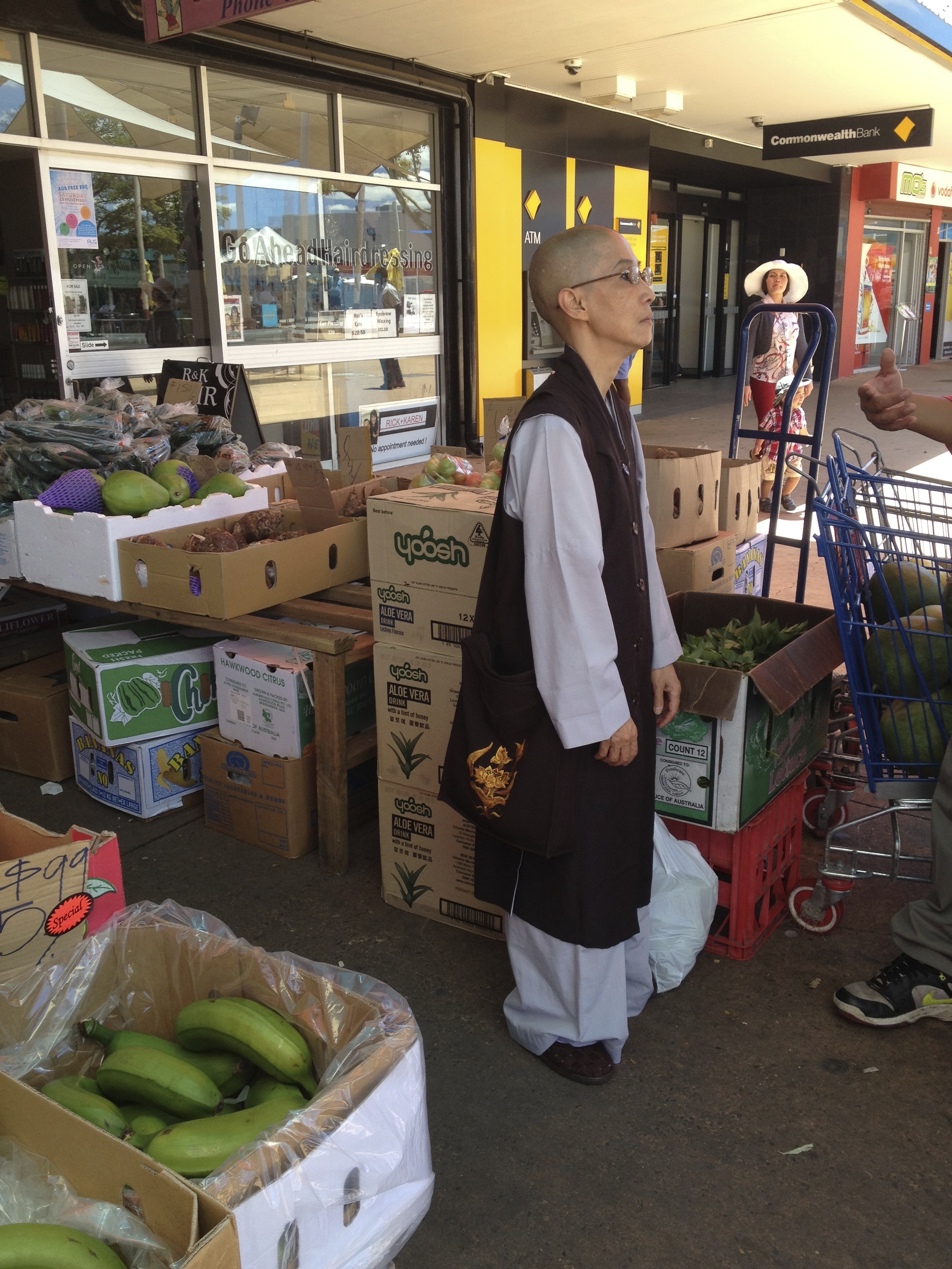 Across the forecourt, Muslim women cradle their babies, gossip in their native tongue and smile shyly at me. I bump into a monk buying green Asian vegetables. There’s Sudanese people as dark as the blackest night. All big white smiles and colourful short-sleeved shirts. There’s not too many of us white fellas here. And certainly no tourists. Just people going about their every day business.