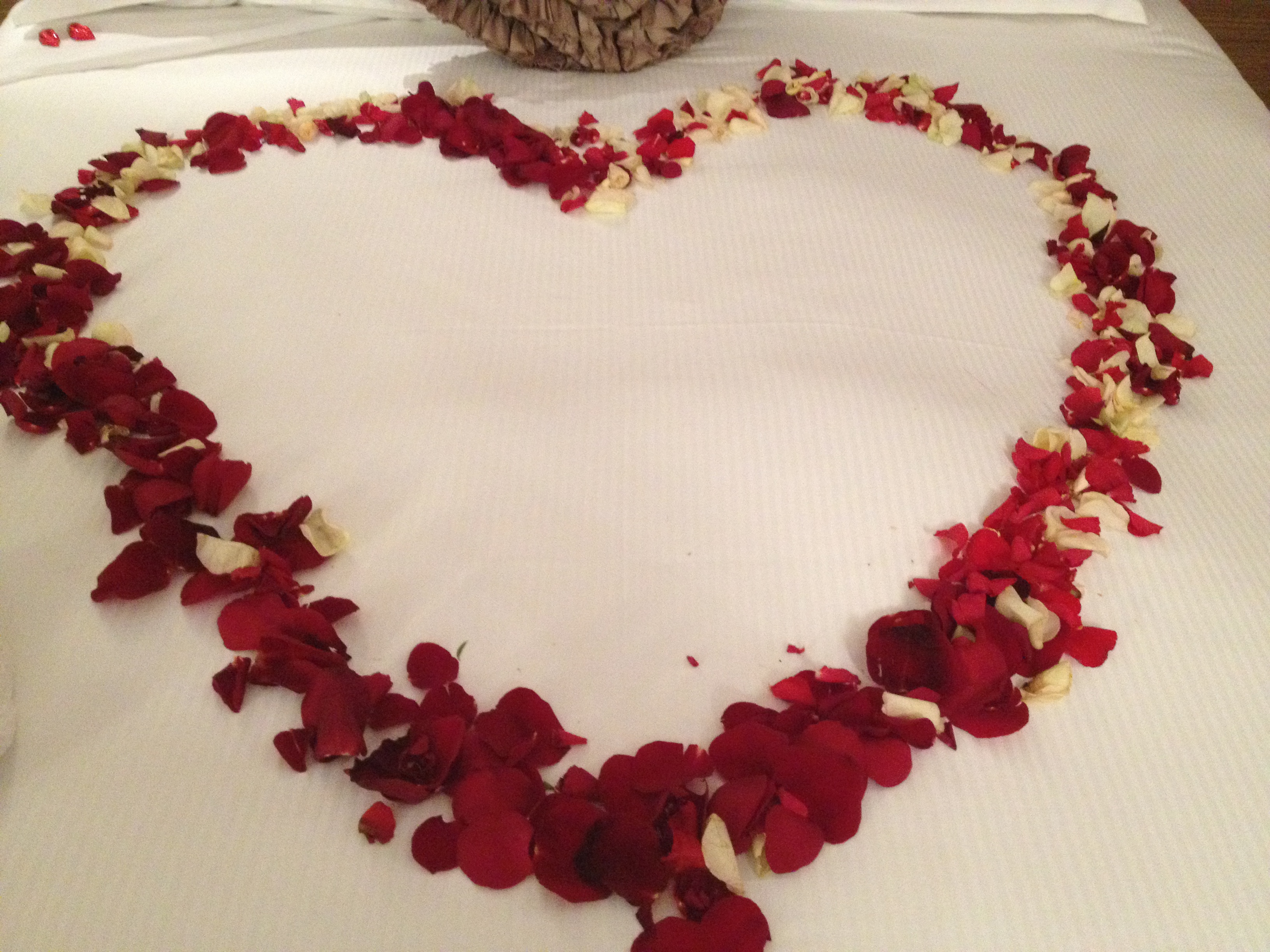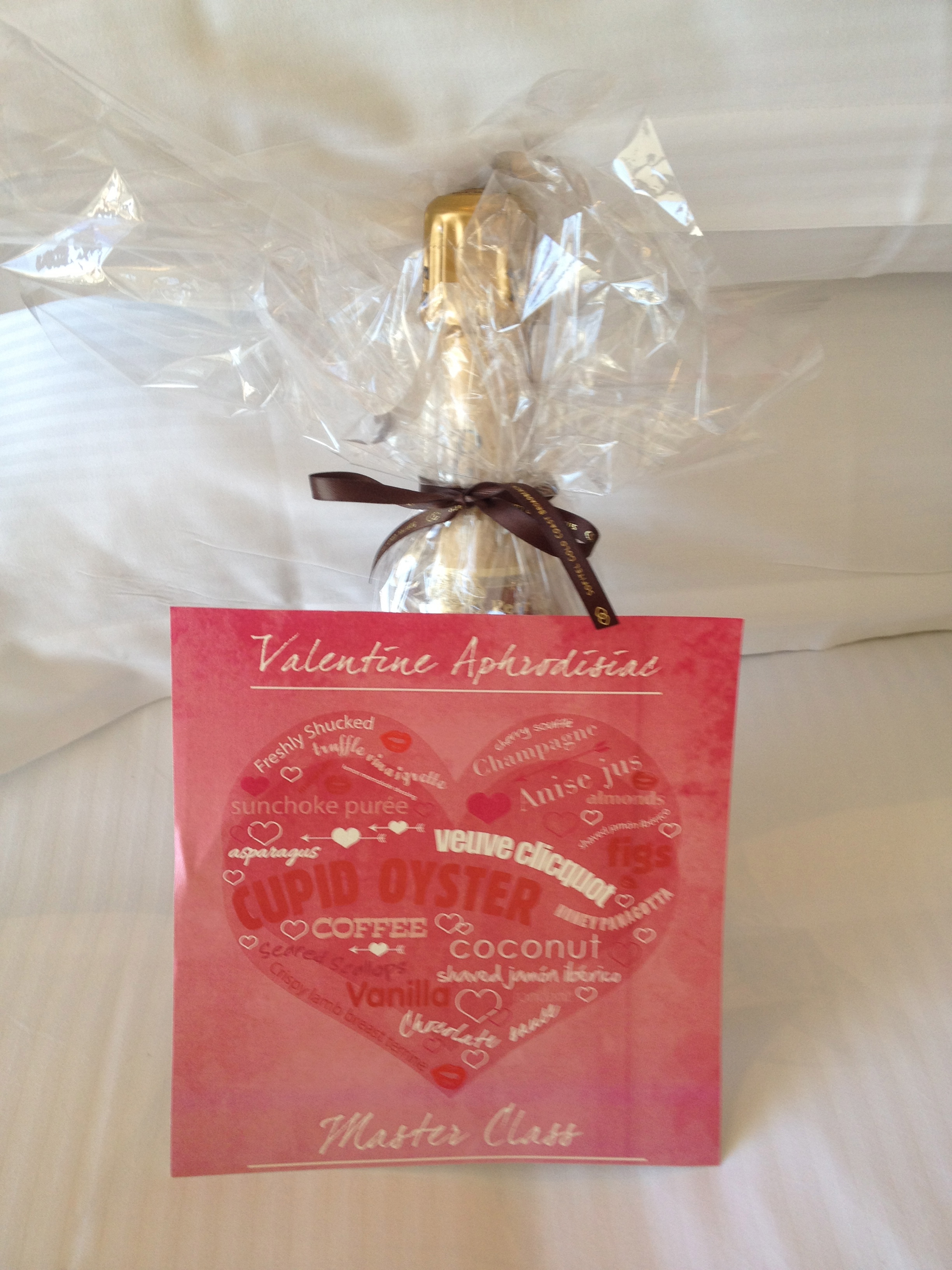 I head back to my room ready to retire my chef’s hat and apron but the hotel has other ideas in store for me. My rather enormous bed is covered in rose petals in the shape of a love heart. I’ve had one or two champagnes, so at first I think I’ve mistakenly entered someone else’s room. But I carefully slip myself under the doona – not unlike one would a slice a cheese into an already packed sandwich – and fall asleep laughing myself silly at cupid and his crooked bow. The next morning, with rose petals scattered all over the bed, the floor and a couple stuck to my face, and as I consider how I’m going to explain this carnage to the housekeeper, I reflect on life and love. My eye catches the bottom of the Valentine’s Day menu beside my bed, upon which is inscribed the words: “magnez bien, riez souvent, aimez beaucoup”. Which translated means: “eat well, laugh often, love much.” And so while I wait for cupid to get his damn arrow straight, this is what I plan to do.