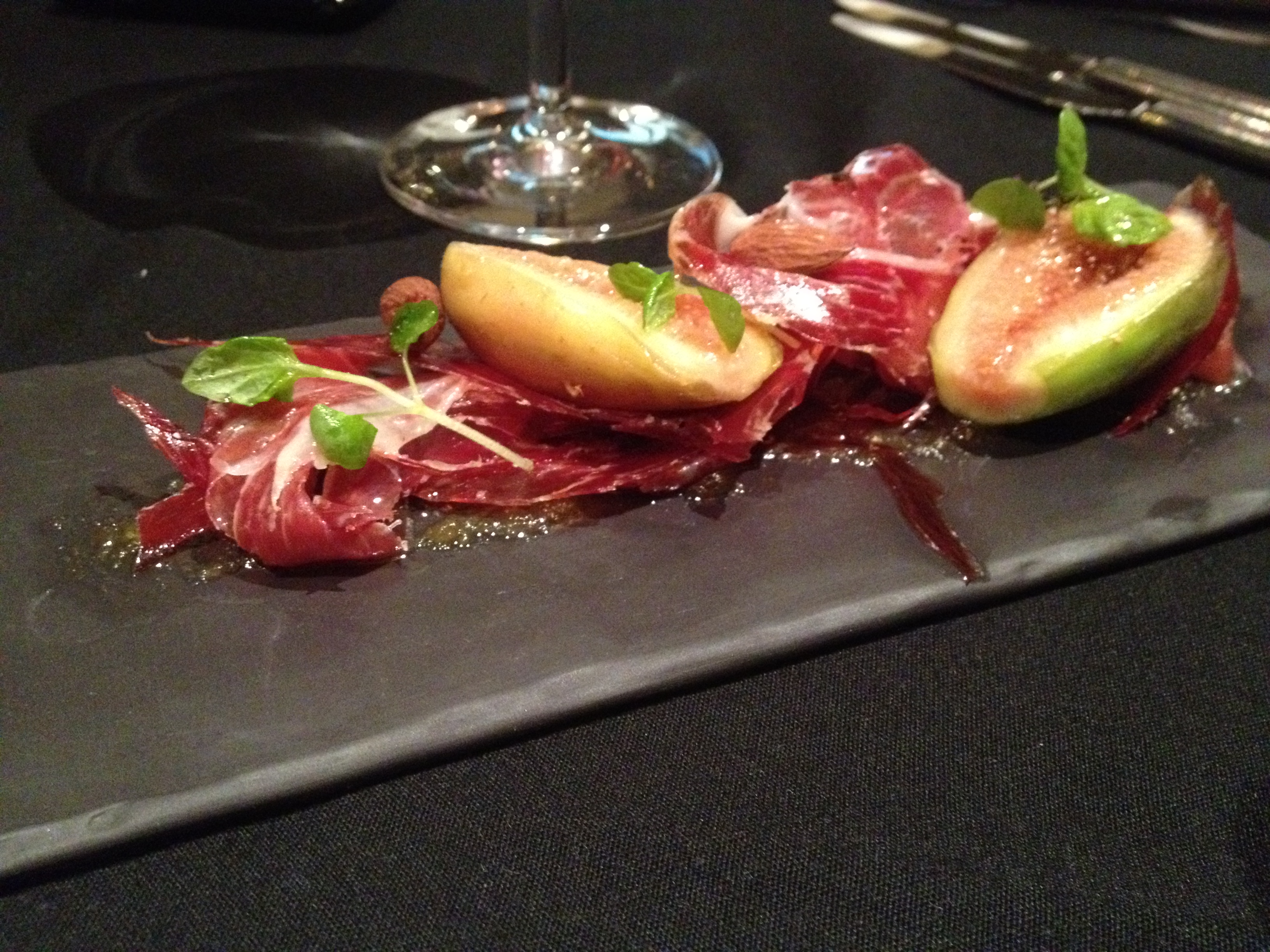 The oyster is followed by a shaved jamon iberico with figs and almonds with a lemon marmalade dressing. Figs, it turns out, are a synonym in erotic literature for female sexual organs and so revered by the ancient Greeks when it came to fertility, they were more precious than gold. Almonds are also regarded as fertility symbols and those with almond-shaped eyes are considered sexy. This, I reflect, could be my problem. I don’t have almond-shaped eyes.