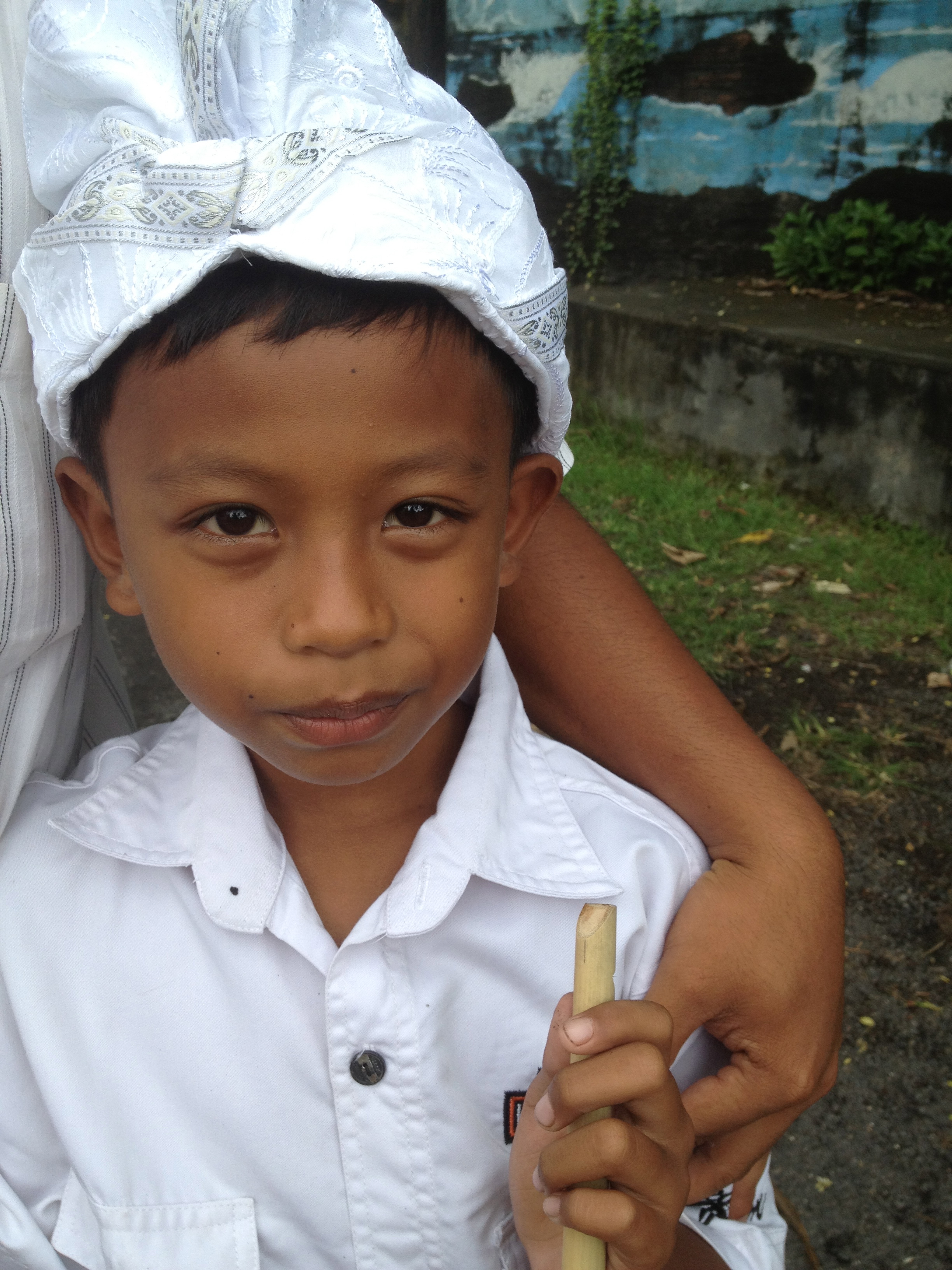 This particular journey begins at Kadangu where I meet the family of Nicole’s assistant Putu who has asked us to join them in a sacred Hindu temple ceremony at Tabanan. Dressed in traditional Balinese sarongs and sashes borrowed from Putu’s mother we walk down a sliver of stairs. First we join several other Balinese in a ceremony which involves a series of prayers combining smoke from incense and flowers in a small basket we each possess. An elderly priest blesses us in holy water and we select a pinch of rice which we stick to our foreheads, hearts and sprinkle over our heads. We head over to a second section where we cleanse ourselves in water before the third and final prayers at another part of the temple. Days later we learn that Putu’s seven-year-old daughter Gita has asked her mother how we western girls sleep. Gita is concerned that we sleep with our eyes open.