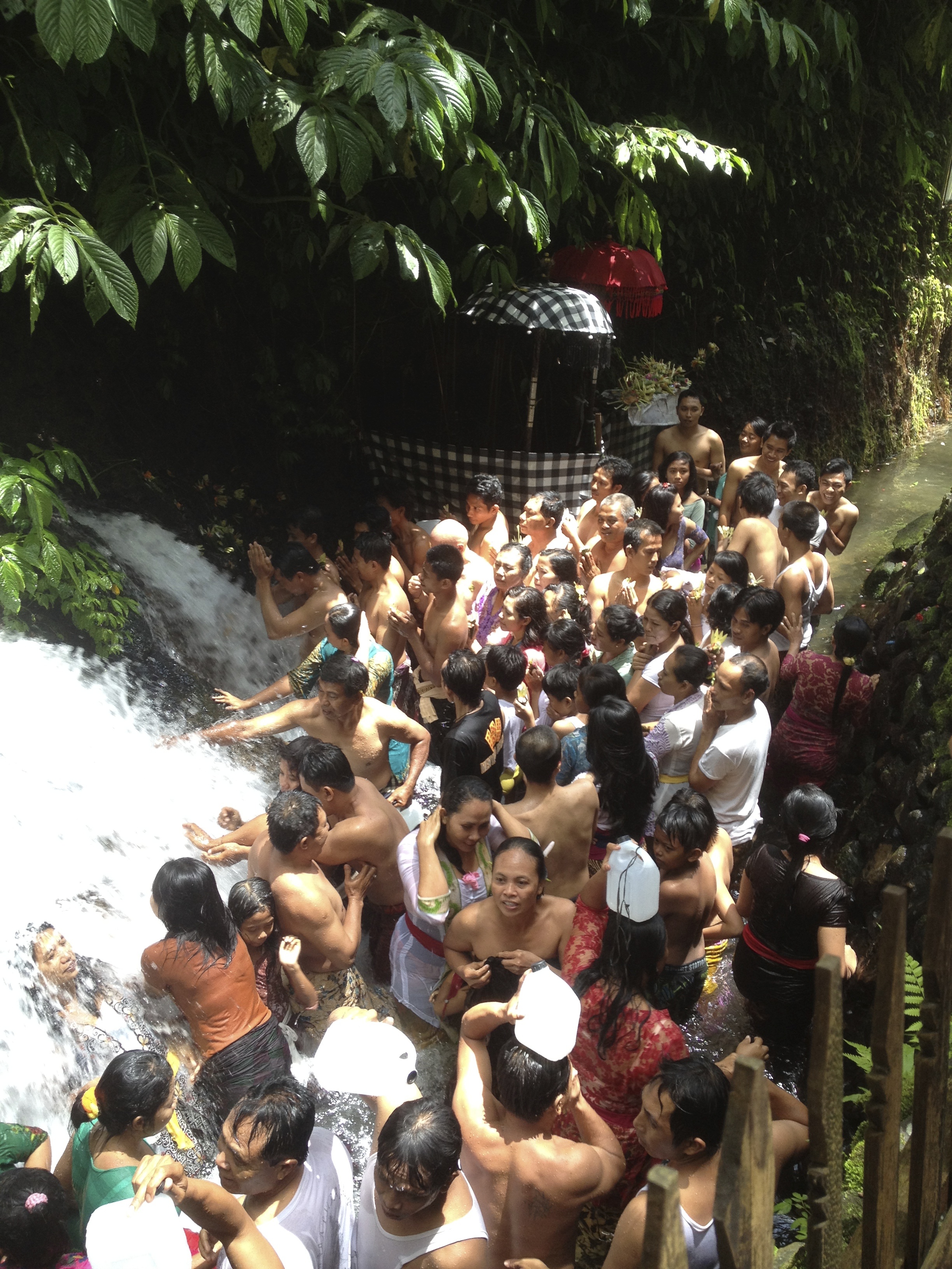 Two days later we undergo a cleansing at a waterfall near Ubud, trekking down some 300 stairs in our tight sarongs, sashes and white shirts. A similar process to the temple ceremony is repeated before we walk, fully clothed into a gushing cold spring. Here we must focus on letting go of our bad experiences of the past, and embracing the new as the water pounds our bodies. I focus on forgiveness and moving forward. I ask the Gods to help me find true love. Just as I turn my back towards the water and lift my face to the sky, the sun comes out. I smile.