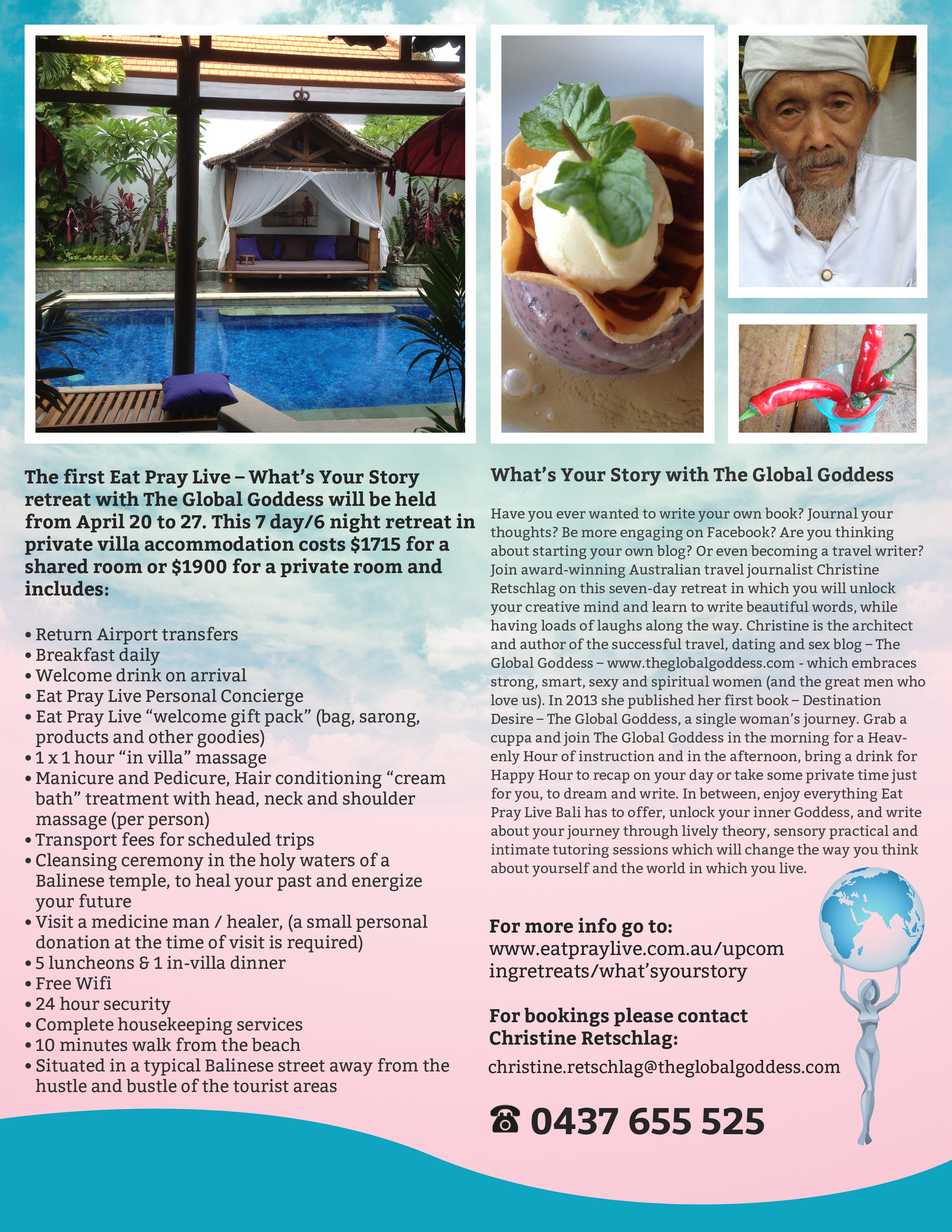 Want to capture your kavorka? The Global Goddess is delighted to announce she will be working with Eat Pray Live and holding regular writing retreats up in Bali. Eat Pray Live – What’s Your Story with The Global Goddess will teach guests everything from how to write a book or blog, engaging in an entertaining manner on facebook and twitter, and even becoming a travel writer. Join The Global Goddess for her morning practical Heavenly Hour session, partake in Eat Pray Live activities, and come back for a Happy Hour session to discuss and pen your experiences. The Global Goddess and Eat Pray Live are on hand to guide you and introduce you to the best of Bali and most of all, to help you rediscover yourself.