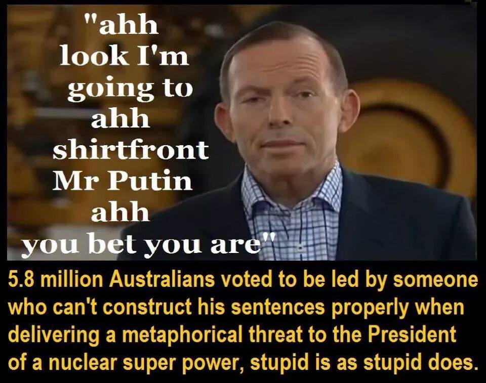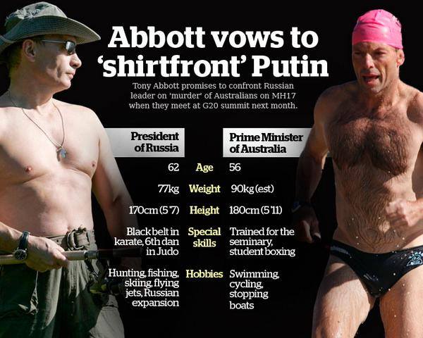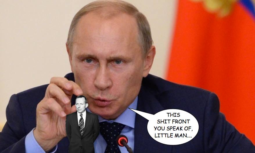 JUST when we thought Australian politics couldn’t become any more bizarre, Prime Minister Tony Abbott proved us all wrong this week, when he threatened to “shirt-front” Russian President Vladimir Putin during the G20 summit in Brisbane next month. Being a Queenslander, I have to confess I had no idea what this shirt-fronting business was all about, and for several hours I thought there might be some kind of bro-mance going on between Tony and Vlad. For those who don’t know what this quaint turn of phrase means, it is apparently an AFL term to describe a front-on charge designed to knock an opponent to the ground. Frankly, since learning this, I haven’t stopped laughing all week.