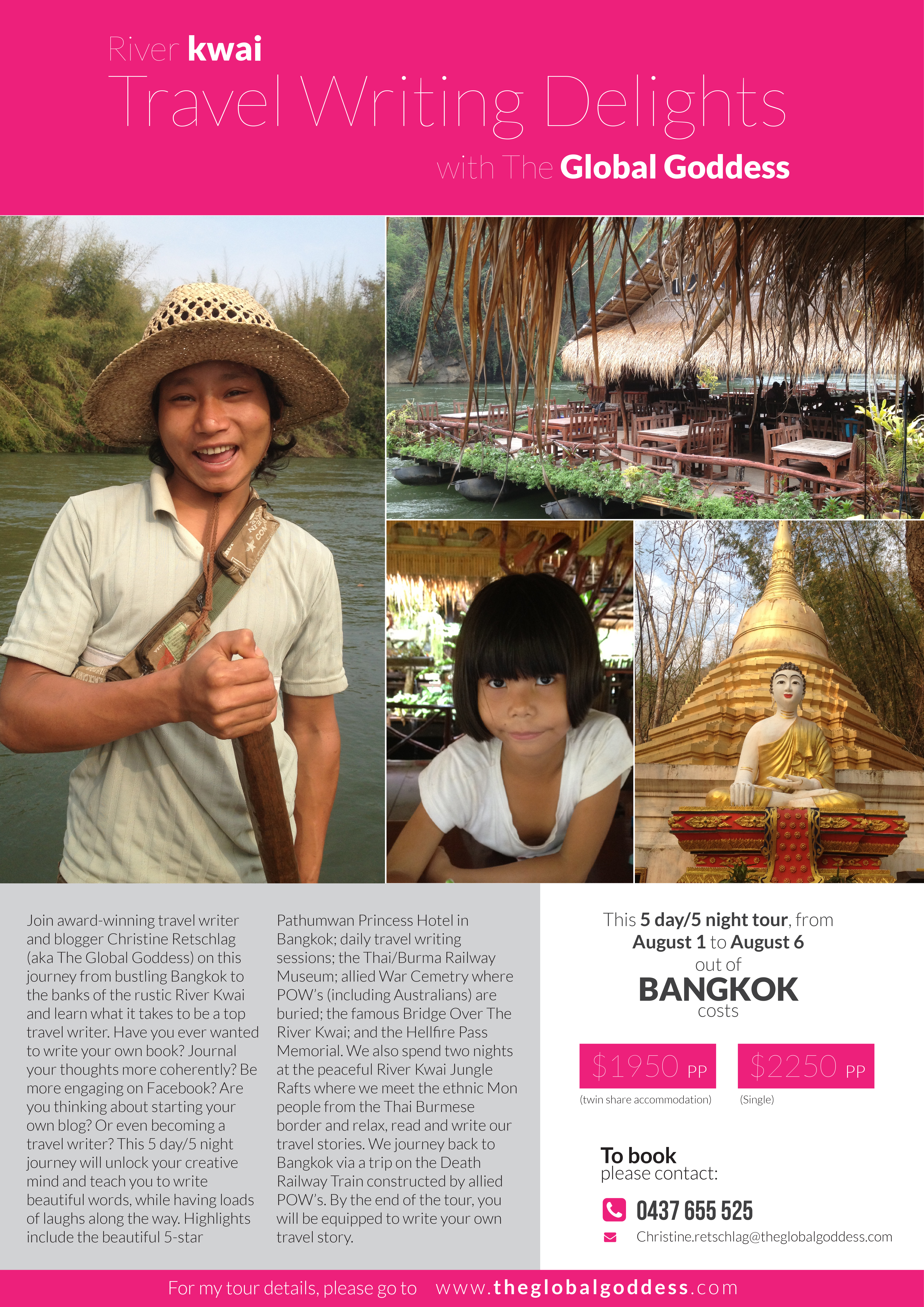 I penned these words a year ago on my fourth trip to the rustic and incredibly beautiful River Kwai region, pondering what it was that kept drawing me back to this part of the world. I still have no answers, but the pull to return there has emerged again, and this year, I’d love to take some of you with me. And so, I am delighted to announce I have launched a new tour River Kwai Travel Writing Delights with The Global Goddess. In early August, we will be meeting in Bangkok where we will spend two nights in a luxury five-star hotel, before we embark on our journey to the River Kwai. And along the way, we’ll be observing, day dreaming and writing about our travels.