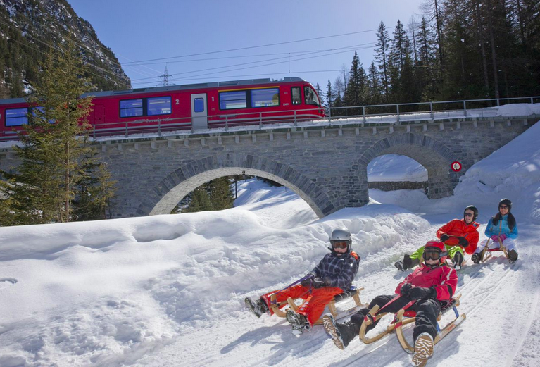 Bernina Express: Chur-Tirano. Landwasserviadukt bei Filisur, 65m hoch und 136m lang. Wahrzeichen der RhB und UNESCO-Weltkulturerbe.