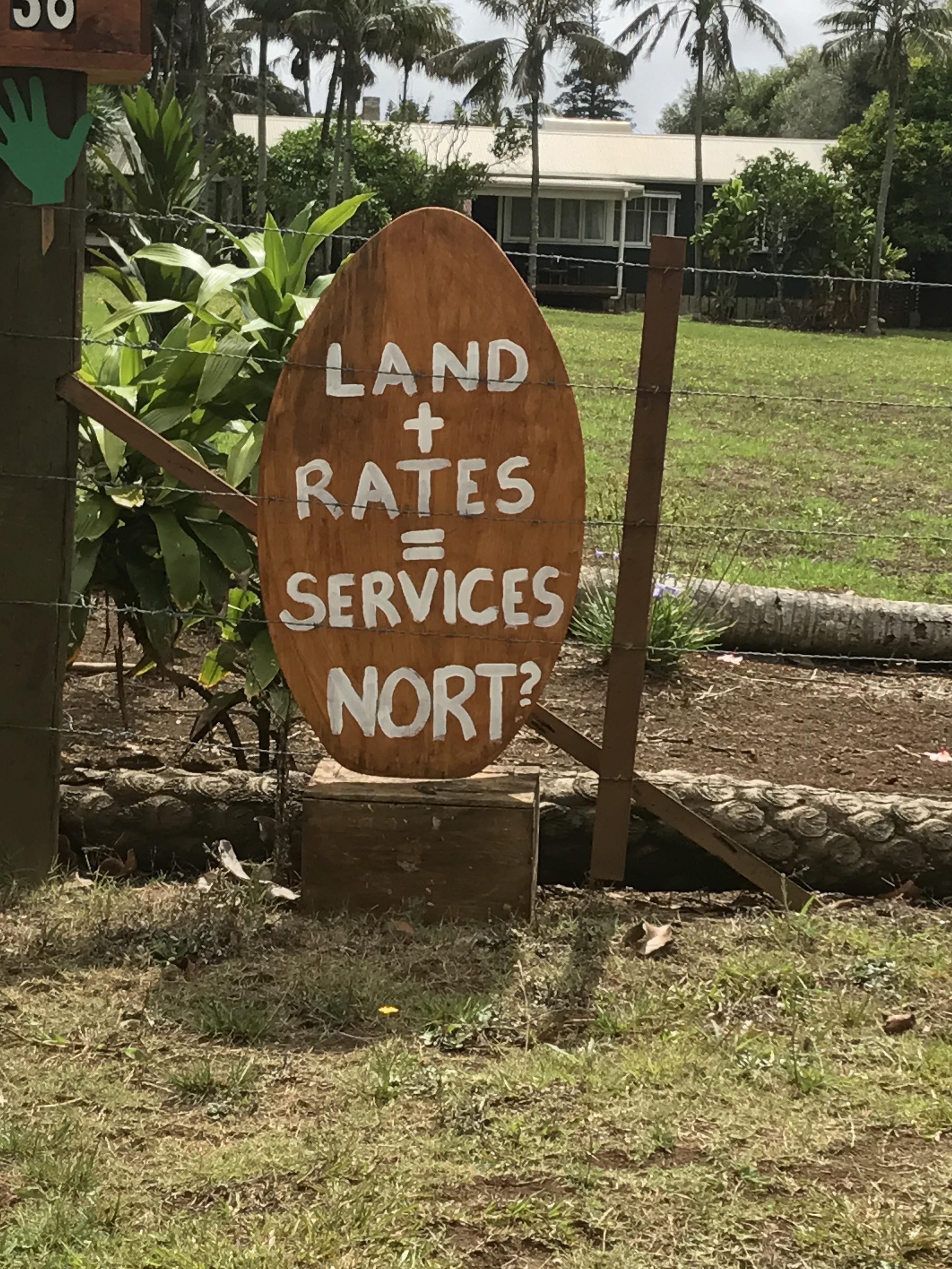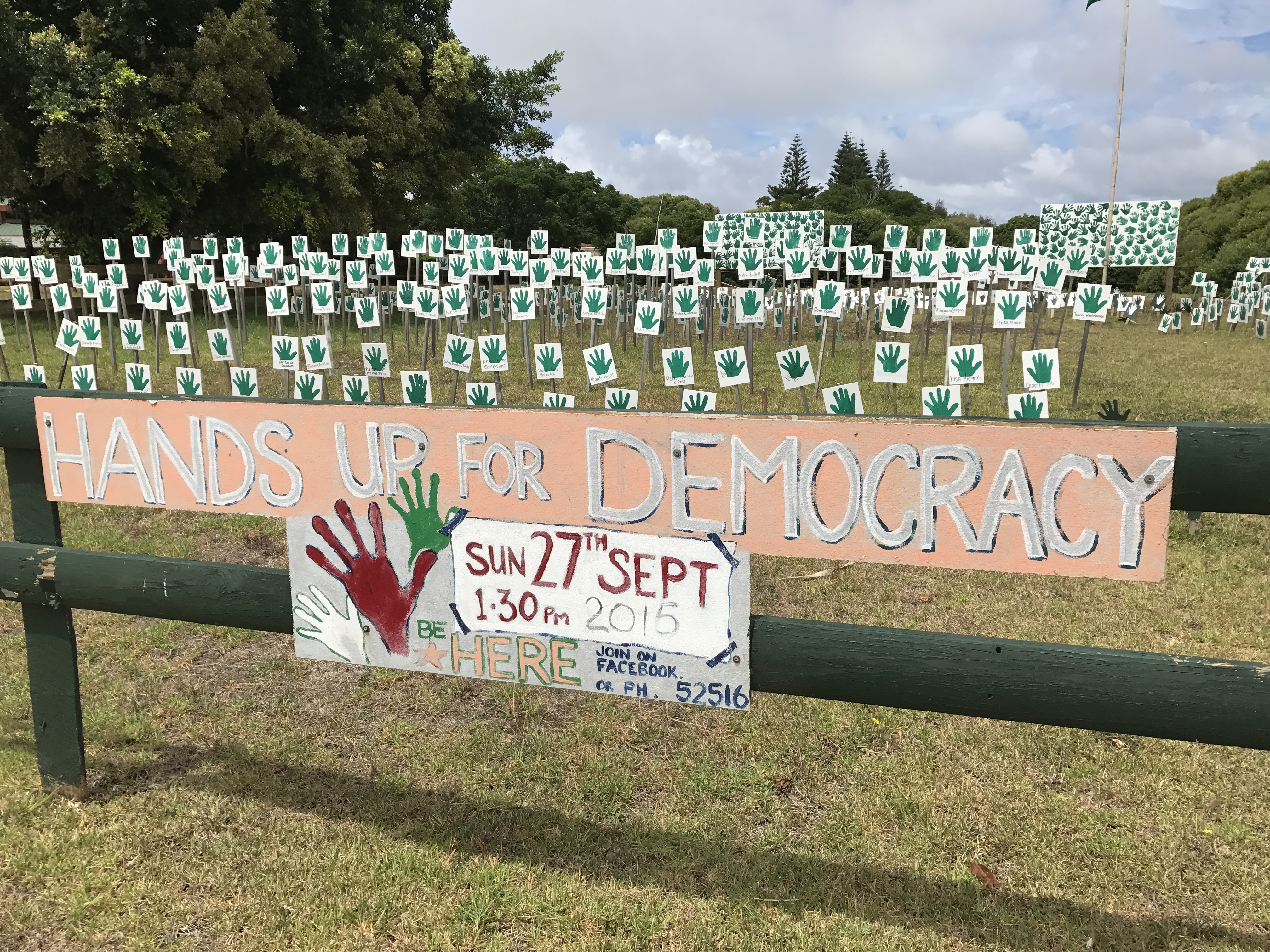 Fly out of Australia and you’ll discover just what a confusing mess the situation is. Firstly, you fly out of an international airport, with your passport and fill out your immigration departure card. About 10 minutes into the flight, you will then be handed an immigration arrival card, asking you questions such as “how long did you spend overseas” and “in which country did you spend the most time”. Um, Australia? As for where you intend to stay, I was unclear whether they meant my Brisbane address or my Norfolk Island address, and I was told by Border Force officials that I’m not the only one confused by the changes. (For the record, Norfolk Island had its own arrivals card which worked beautifully, I am told). Now, try being a local. Drive from the airport and one of the first things you’ll encounter is a field of green hands, known as Hands Up For Democracy, which is intended as a “silent protest in the paddock”.