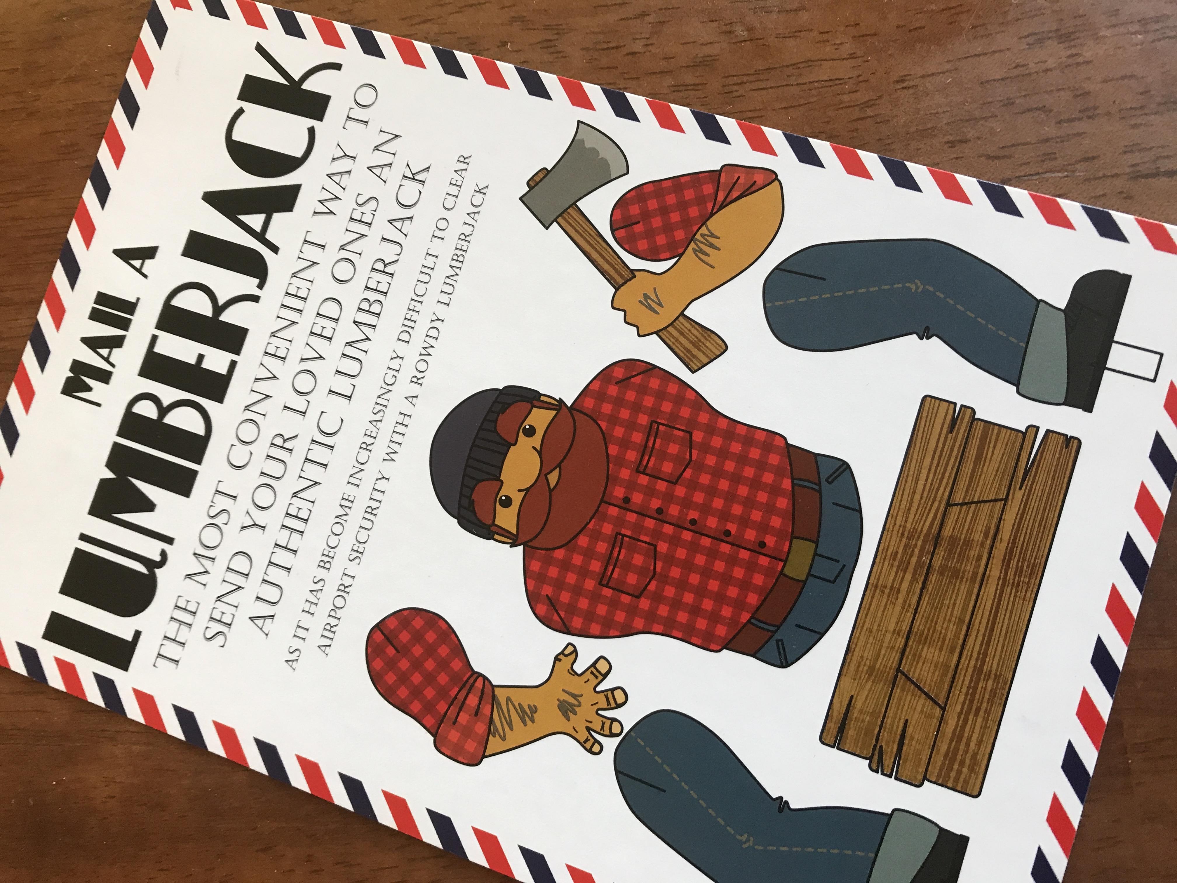 Fresh from her travels in the Yukon, Julie Miller posted me my own lumberjack. As the card says: “As it has become increasingly difficult to clear airport security with a rowdy lumberjack.” Thanks Julie, he was very handy with the, err, wood…