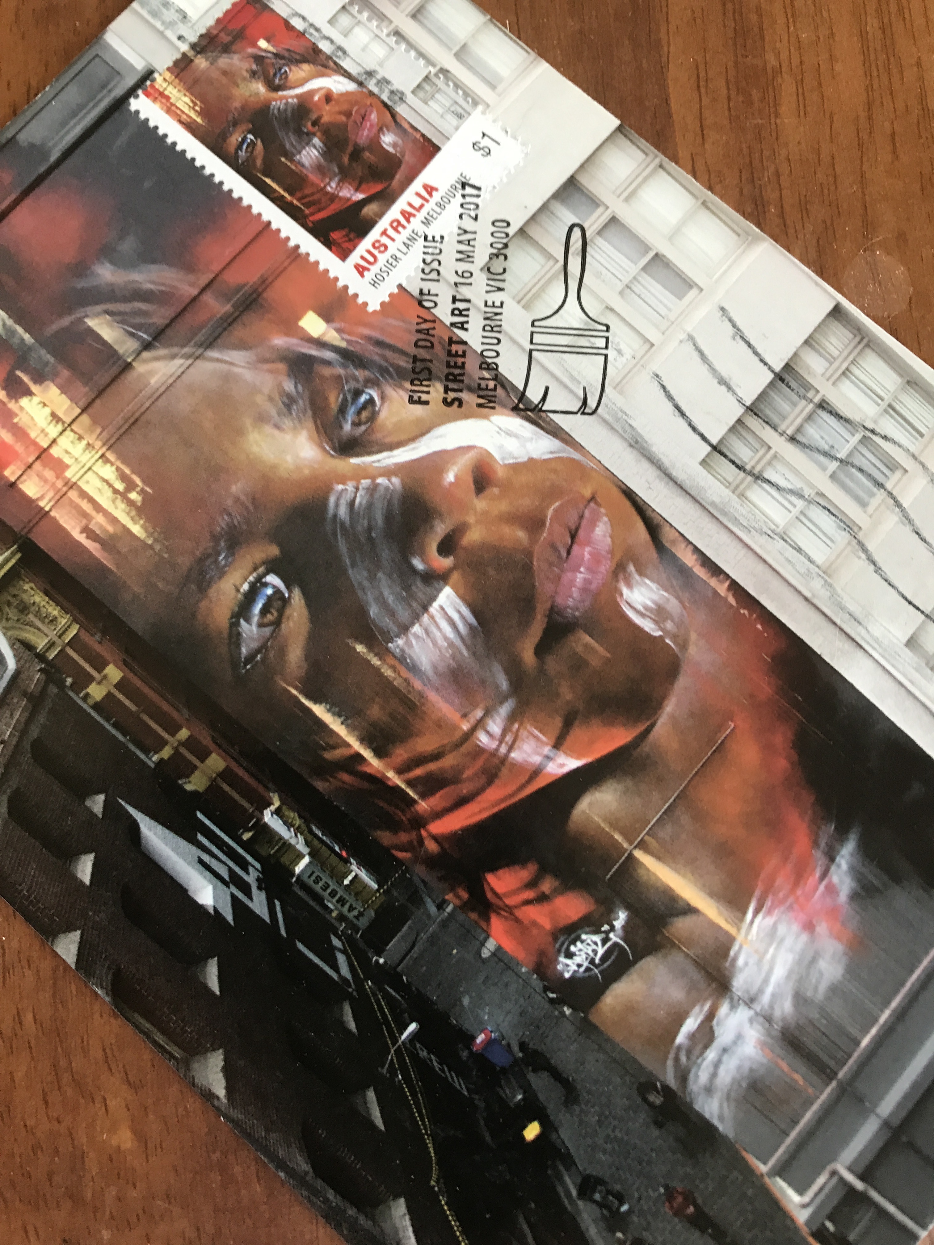 Travel writer Bev Malzard sent this sensational street art pic (my Instragram leans heavily towards graffiti art) replete with matching stamp.