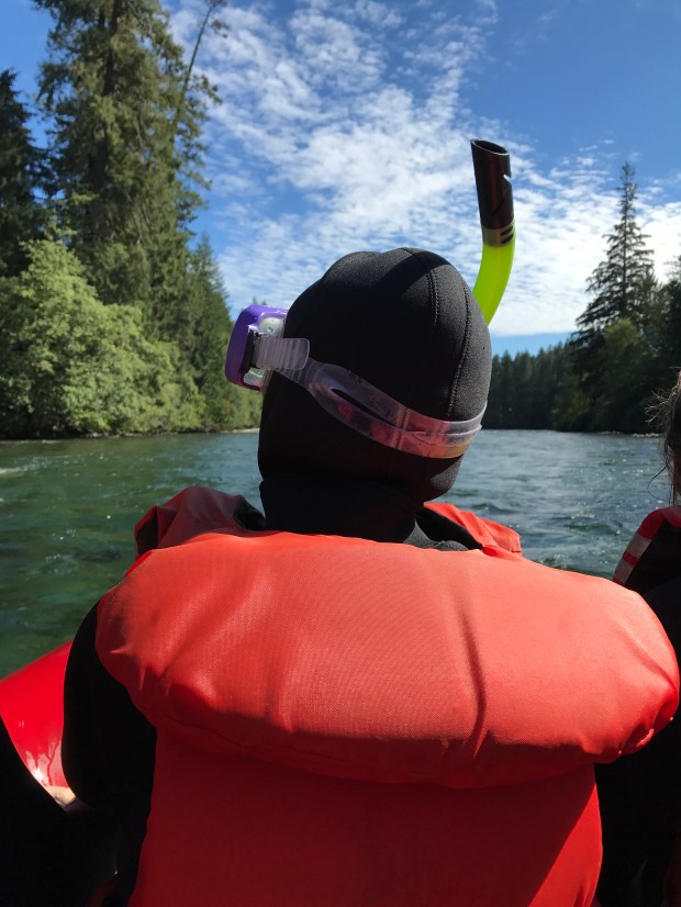 The next day, Destiny River Adventures owner and tour guide Jamie Turko, who runs the Snorkelling with the Salmon experience, warns us not to wee in his wetsuits or they will become ours, at a price. I’m a little worried, this is a three-hour tour during which we will spend a good part of the time in crisp 14 degree waters. I can’t guarantee anything and hope if I do pee myself, Jamie can’t spot it from the boat. I suspect Jamie sees everything.