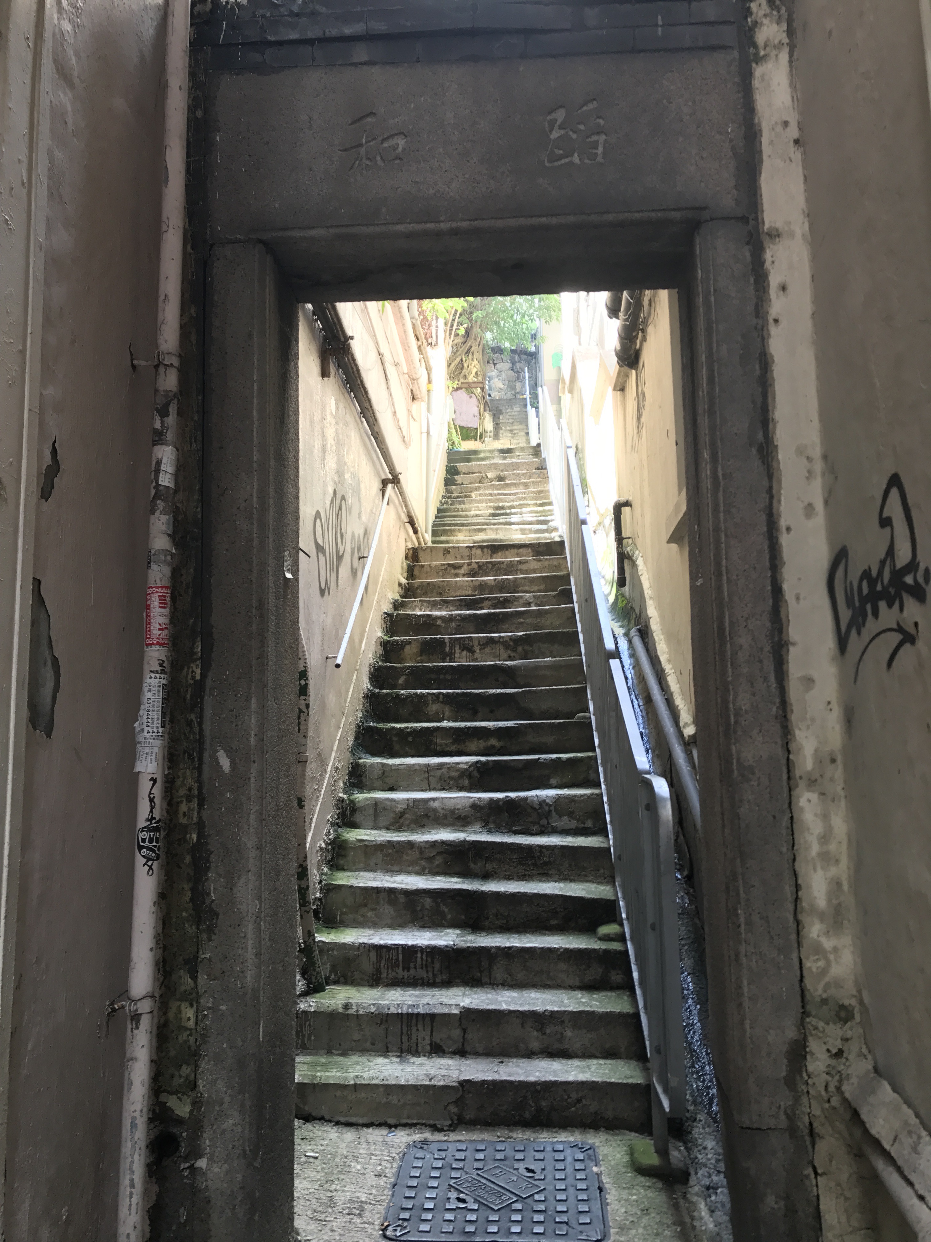 Stairway to heaven. A steep and mysterious stair case replete with traditional Chinese entrance to frame it. One of the few old staircases of its type left.