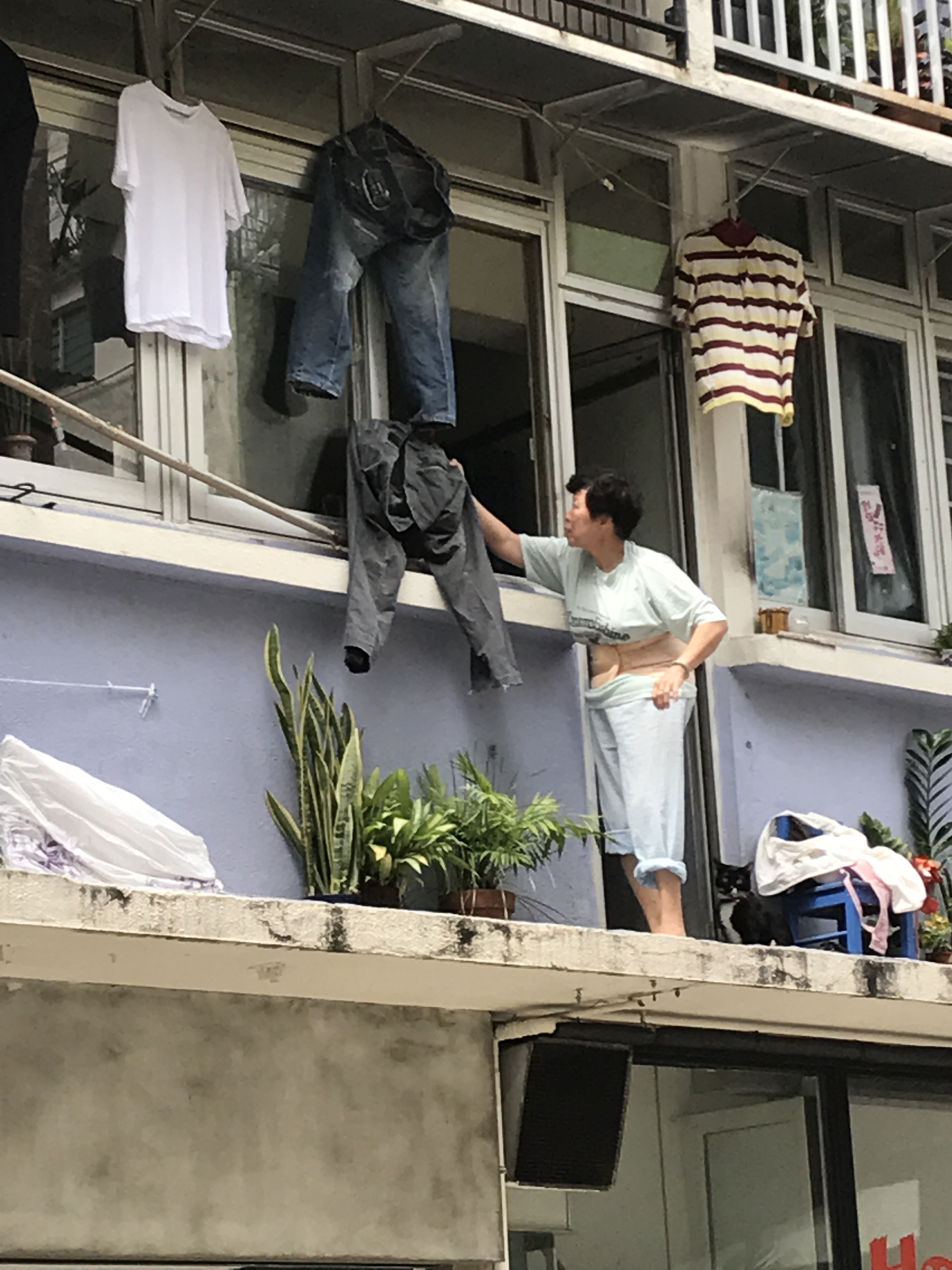 Washer woman. This elderly woman perches precariously on her outside ledge. No backyard in which to hang your washing? No worries. Hong Kongers use every inch of space and washing is no exception.
