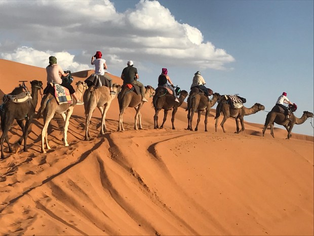 I am on a 13-day Intrepid Tour through mystical Morocco and up until now, things have gone swimmingly. Khaled, my Intrepid Tour Guide, a man for the traditional Berber tribespeople of Morocco, and someone who has become a friend, walks beside me for a while, until it becomes abundantly apparent he is annoyed with my antics. He attempts to show me a “shortcut”, leading me along a knife edge of dunes that are as high as 150 metres and drop away dramatically either side, but I am having none of it. We come to a standstill and bicker like lovers. “You said the sand was hard,” I protest. “No, I meant hard to walk on,” he reasons. Ah, by “hard” he meant “difficult”. Eventually, frustrated, he dumps me back at the camel caravan and disappears into the desert, his long, blue Berber robes flapping dramatically against the rusty landscape.