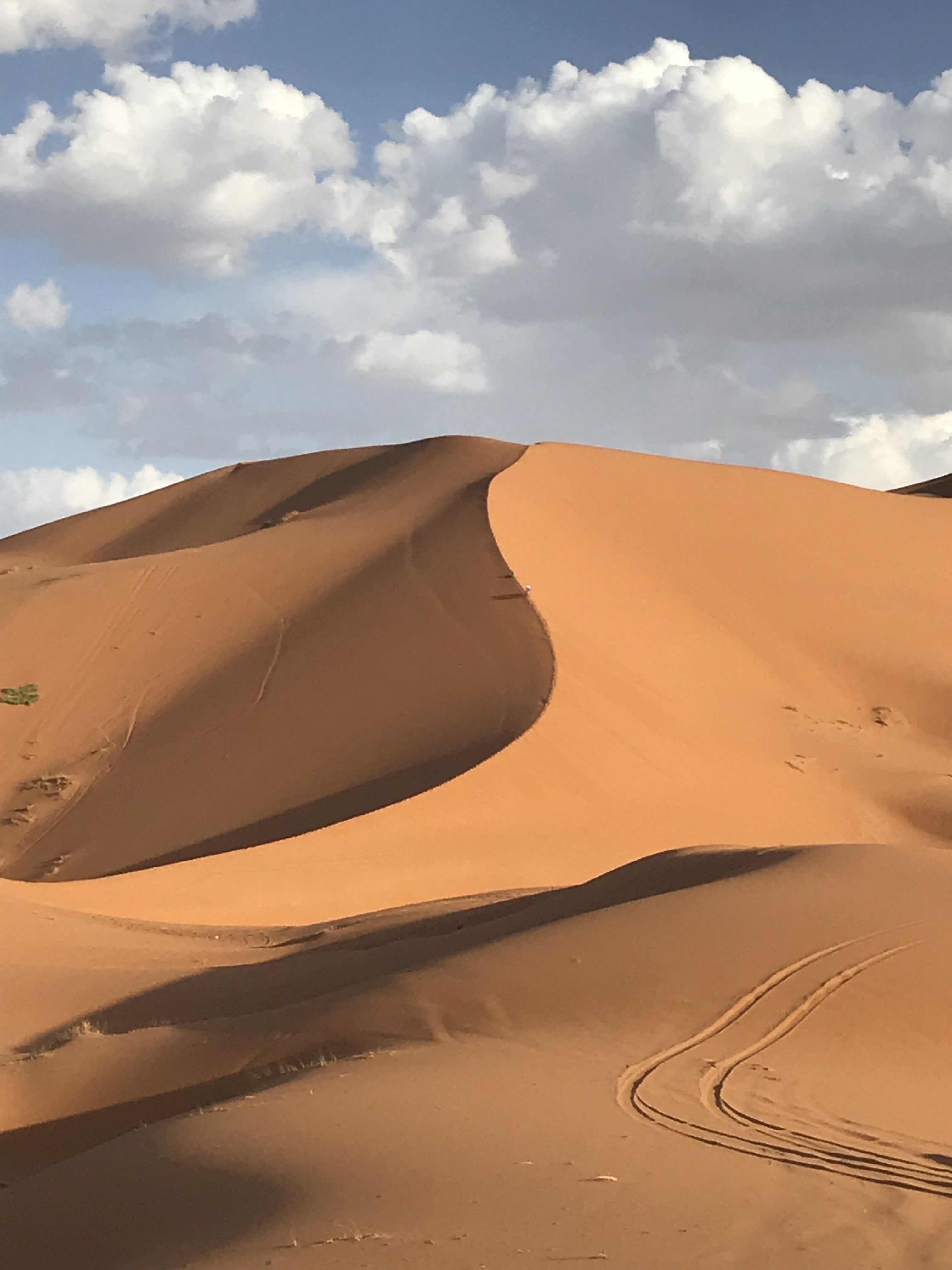 Later that night we eat a simple beef tagine and lay under the stars on woven Moroccan rugs. The clear, cool, North African night sky is a belly dancer’s costume of diamontes. I crawl into my cot and fall asleep to the sound of drums, before the desert finally concedes to a Saharan silence. The next morning, I lay awake, aching, to the symphony of a snoring camel. Yet there remains one problem. How the hell am I getting out of this desert? Luckily, Khaled, professional that he is, has arranged for me not to depart by foot or camel, but a 4×4 over the desert dunes. Under a yawning saffron sunrise, the 4×4 climbs the steep dunes, pauses, and then shoots down into the valleys. I squeal with pure delight. We repeat this giddy trek over and over before I arrive back at our meeting point and I can’t help smiling. These peaks and troughs remind me of why we travel. You never know what’s over that next sand dune. And it turns out to be the ride of my life.