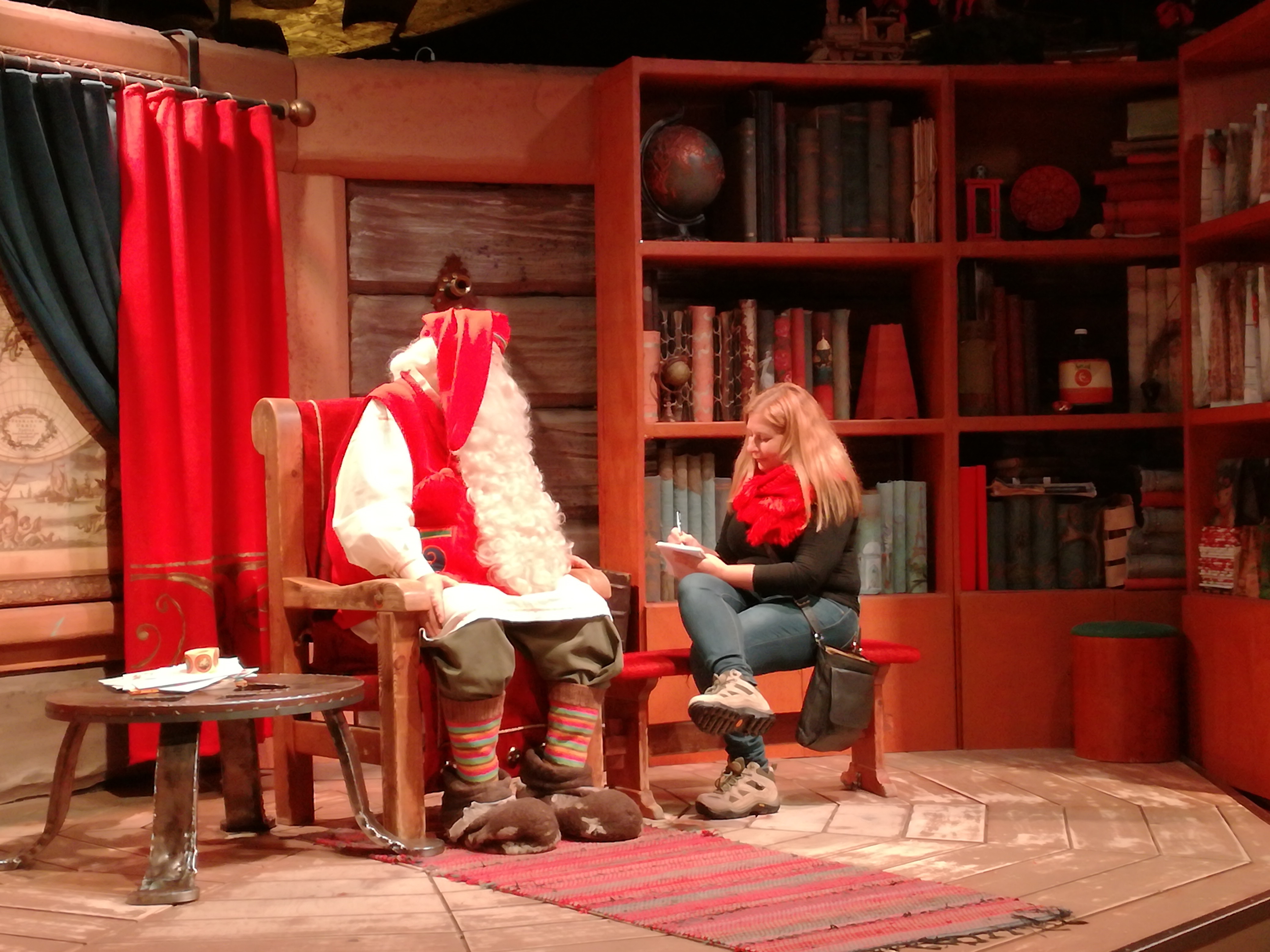 I sleep the night in the exotic Santa’s Igloos Arctic Circle where sublime snow is dumped on my glass ceiling during the night. I’m a tiny figurine inside a Christmas snow dome. I awake, pen my note (tossing in “peace on earth” for good measure), and march through the snow to the nearby Santa Claus Village, where I have the first appointment of the day with Santa.