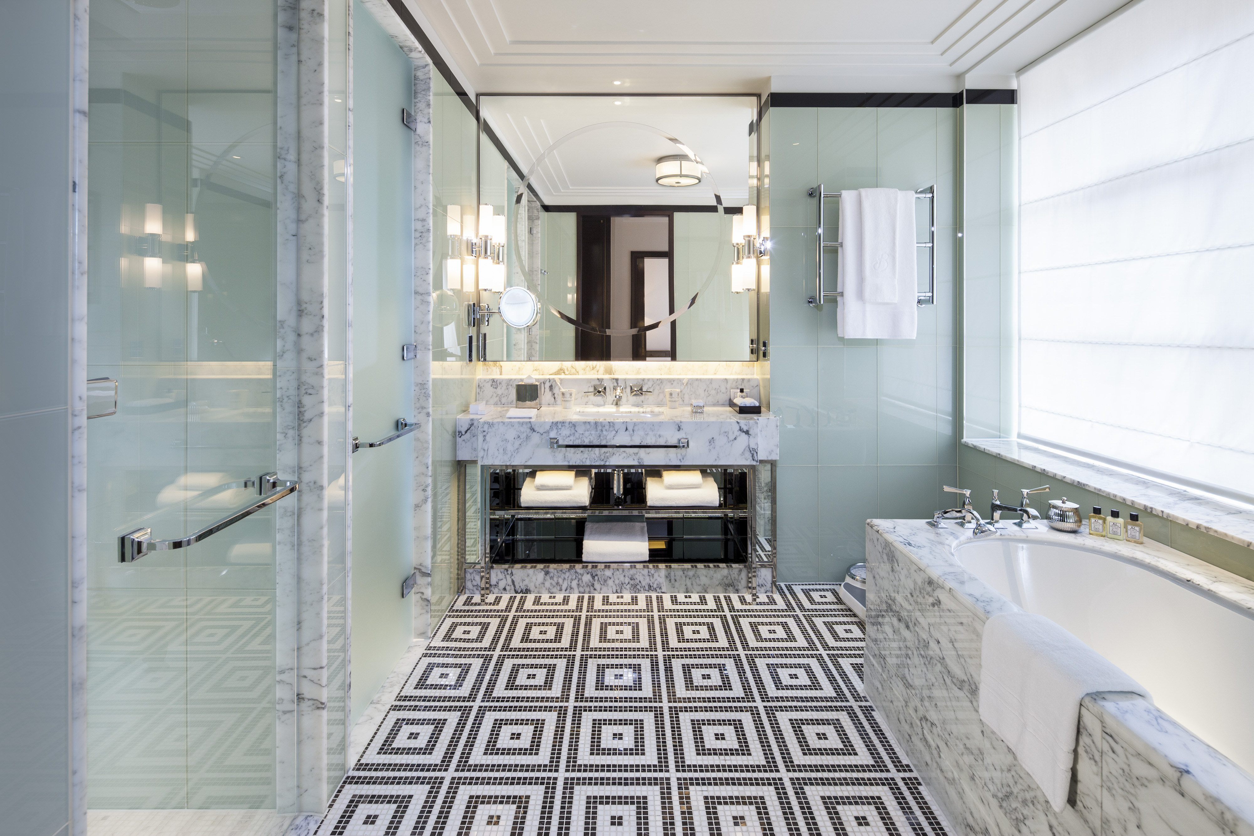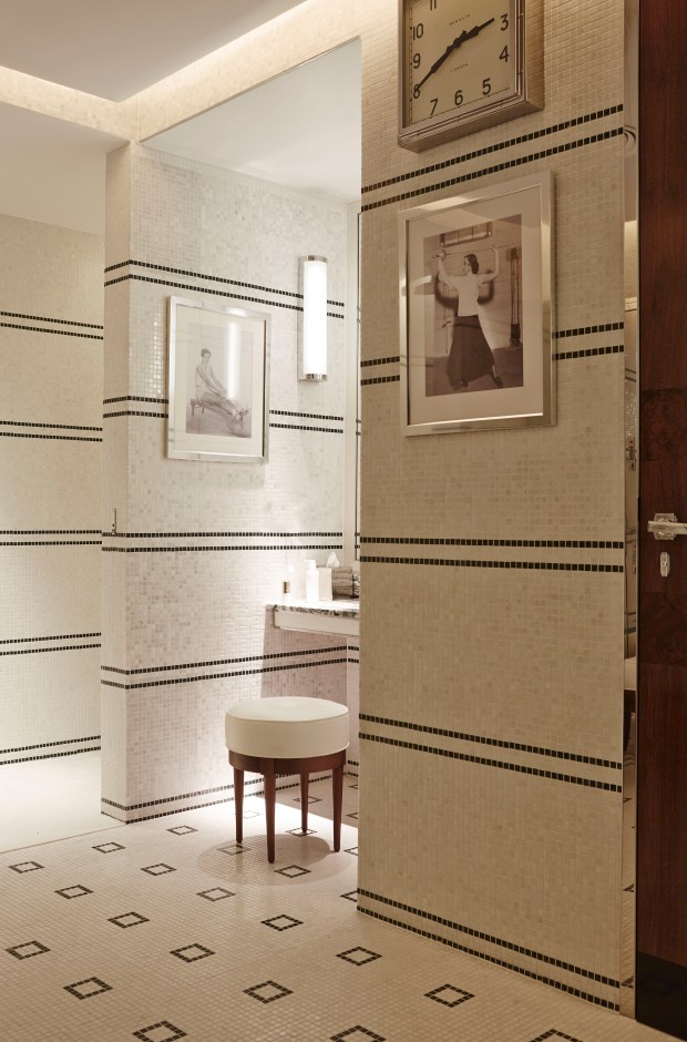 The bathroom is all art-deco black and white tiled heated floors, plush Beaumont monogramed bath robes, lavender bath salts for relaxation and London’s Dr Harris & Co toiletries which date back to 1790.