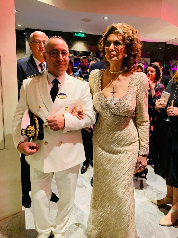 Amid the confusion, my new Kiwi mate and I make some swift decisions. Turn left and we follow the confused crowd. Turn right, and we are in a mad mosh pit of VIPS. We take a sharp right, and walk straight past a waiting Mercedes Benz. The windows are dark but we know who is in there. It’s Ms Loren, but we have no time to loiter as the crowd shuffles us in the rain and wind, back onto the boat. We snatch a champagne from the bar while we contemplate our brief brush with fame. Meanwhile the heads of this Italian shipping company, bless them, rise to the occasion.