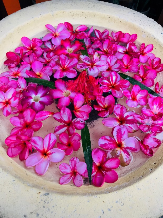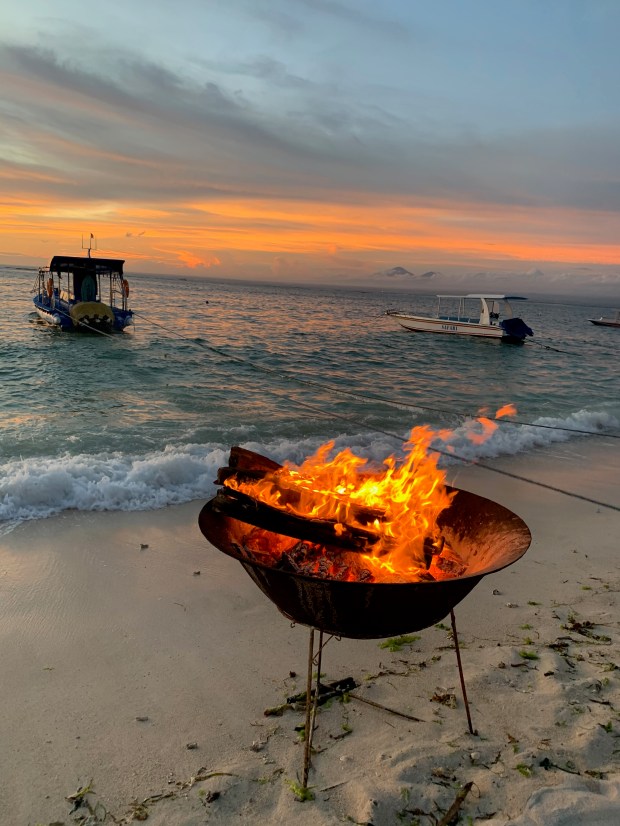 On my second week, I move to the more active part of the island and into another traditional Indonesian hut. I have a discussion with a young German tourist who is grappling with the notion of being blissfully bored. “We have no word for surrender in the German language,” she says, without irony. I advise her to go with the flow. That at first, I too found it difficult. But necessary. I rifle through pre-loved books at my resort, looking for a new tome to read into the night. There’s so few English books here, and I resort to reading trash I’d never consider at home. It’s delightfully decadent. I’m so blissfully bored, I even have time to indulge being sick when I am struck down by the inevitable Bali Belly. For once, with no meetings, no pressing deadlines, no travel, I can acquiesce to the illness and lay in bed all day. When I’m well enough again, I snorkel with strangers in the warm waters which produce similar corals and tropical fish to those at home. I fight strong currents to avoid being smashed against the rocks, chat with foreigners. I walk for miles and hire a kayak to paddle the mangrove forest. I learn the salacious saying for just walking, Jalan Jalan, and use it often when I’m approached for transport. It’s indulgent to use my legs for once. I stop and smell frangipani flowers. Observe the neapolitan swirls of clouds at sunset.