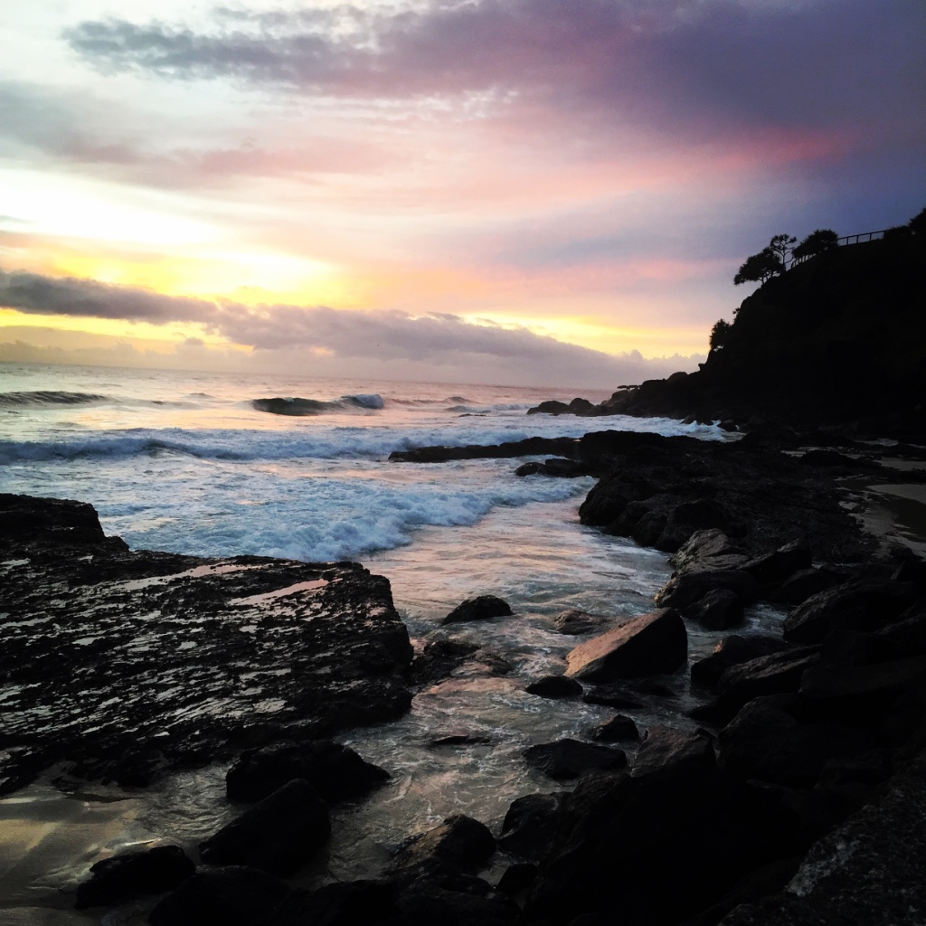 I wake at 4.30am for sunrise at Snapper Rocks where we used to frolic in the rock pools as kids. We loved those rock pools on hot summer days and the danger of the sea spray bursting over the sea wall. On summer nights, when we were tucked up in bunk beds, dad would venture down to stand on those dangerous walls to fish. The tides have taken their toll of the landscape there too, but the green frog rock remains overlooking the beach where one of my sisters got married. I keep shaking my head as if it’s full of salt water. Where did the decades go?